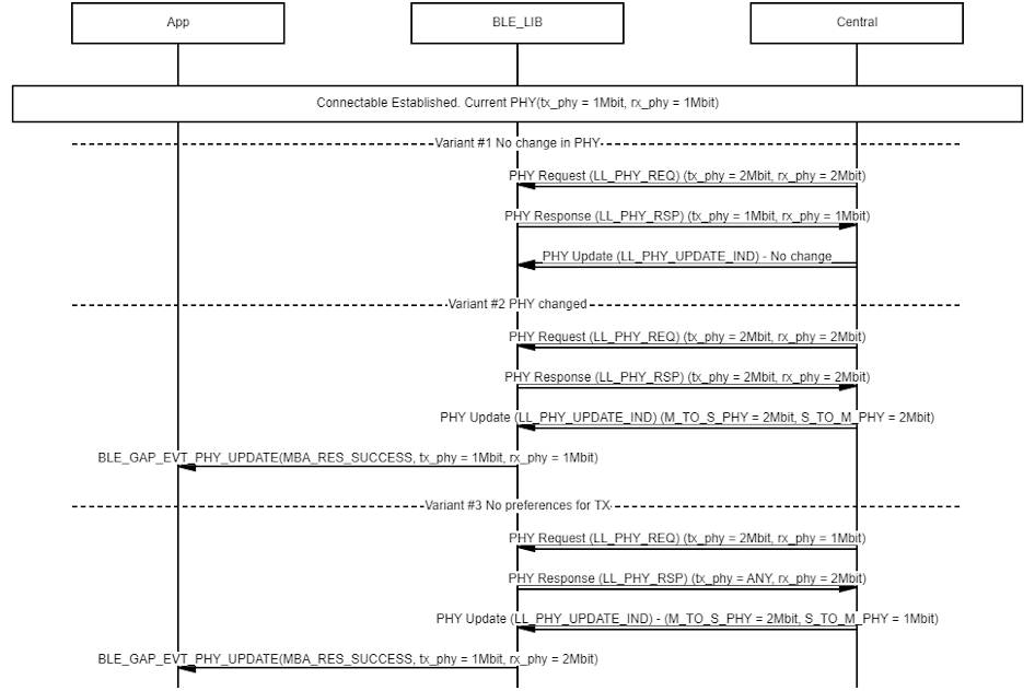 Example demonstrating the central device initiating a PHY update procedure, triggered by the application layer