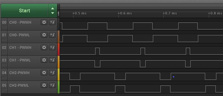 This example application shows how to use the TCC to generate a 2 or 3 phase PWM signals for motor control with dead time.