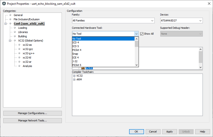 Note: If no debugger is connected, click the Show All check box and select the supported debugger. - Select the target toolchain and click Apply to save the changes