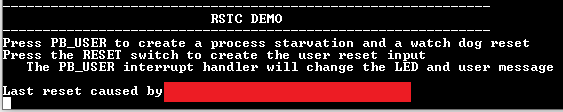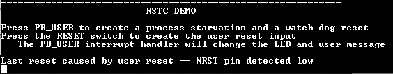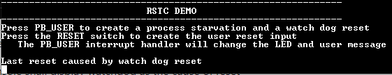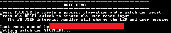 Note: The cause for last reset will differ based on initial user action and is blanked out to avoid confusion. - Press Switch PB_USER to stop petting the watchdog.
