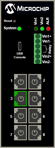 Ethernet Link status is represented by the RJ45 surrounding color. PoE status is represented by the image inside the RJ45 connector. The top Vin1, and Vin2 report on which pair (can be both) a power is applied by turning the respective LED to green. The alarm red LED will be turned on when power is provided only to Vin1 or Vin2, and not both.