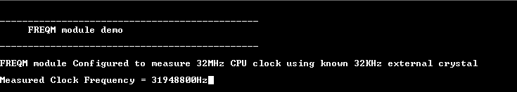 The Frequency Meter (FREQM) can be used to accurately measure the frequency of a clock by comparing it to a known reference clock. The FREQM counts the number of periods of the measured clock with respect to the reference clock. This example application shows how to measure the CPU frequency using the 32-kHz Crystal oscillator as the reference clock.
