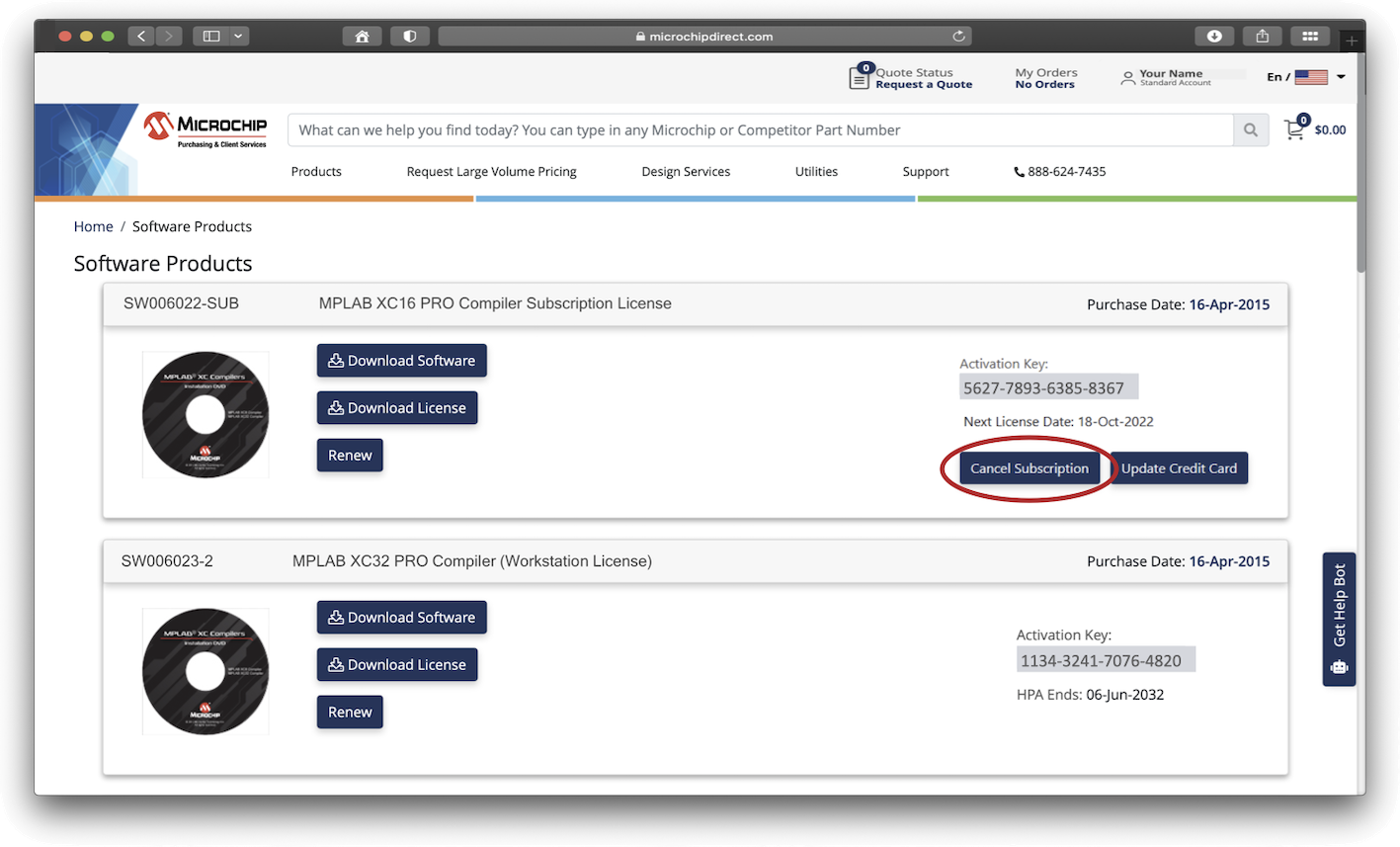 - Login to your account in MicrochipDirect. You cannot access the required tools to cancel a subscription license from your usual mySoftware account, even though these accounts are linked.