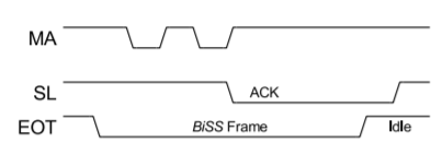 Due to various cable lengths expected in BiSS applications, automatic line delay compensation has been included as part of the BiSS engine. Automatic line delay compensation can be calculated as the difference in time from when the client first receives a Clock signal from the host to the time when the host first receives an Acknowledge from the client (see Figure 26-13). The included INIT bit within the BiINSTR register not only resets status registers, but also initiates the line delay compensation by initializing the channel. The INIT bit can be used and then read from the BiSCDATA0L register to read the detected delay value. To see the behavior of the INIT sequence, see Figure 26-14.