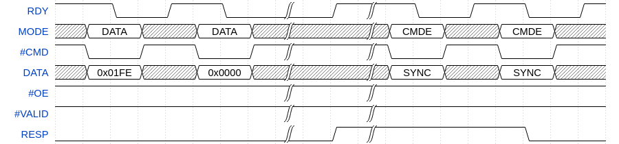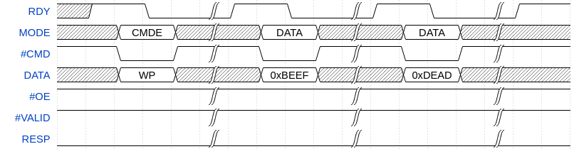 In the above example, the sequence of bytes [0xFE, 0x01, 0x00, 0x00] is written into the page cache. The page boundary is crossed after byte 0x01 so the 2nd DATA command triggers a page cache flush. This flush operation fails, so the FFPI Monitor raises the RESP line. Later the host sends two CMDE commands to acknowledge the error so the FFPI Monitor lowers the RESP line.