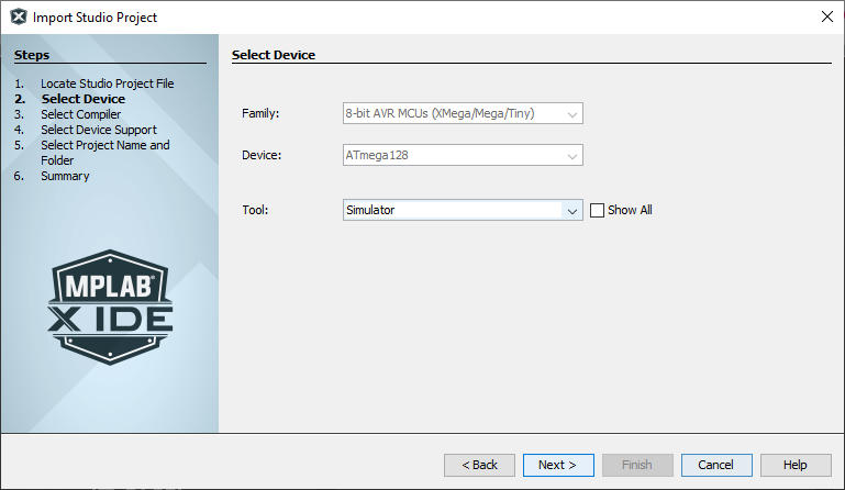If the tool is not available in MPLAB X IDE, you may select a different tool from the drop-down list, but you may want to keep the original project tool until after import to ensure your project is working correctly. Then you can select a different tool in the Project Properties dialog.