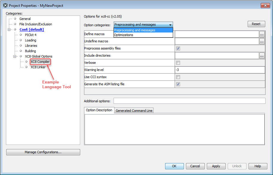 Options entered into the IDE may differ in format from those entered on the command line. Click on an option name to see more information on that option in the “Option Description” tab. Also, after entering or selecting option data, click the “Generated Command Line” tab to view its contents and ensure the command line code generated by the option is what you expected.