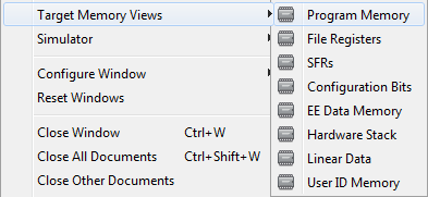 Memory windows () display the many types of device memory, such as SFRs and Configuration bits. Use the Memory and Format drop-down boxes to customize your window.