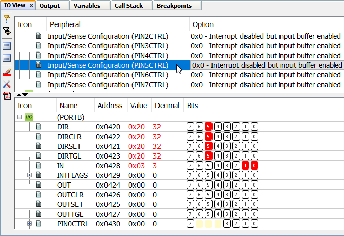 Use the I/O View window () to see an overview of registers of the target device for the current project. For an overview of operation, see: