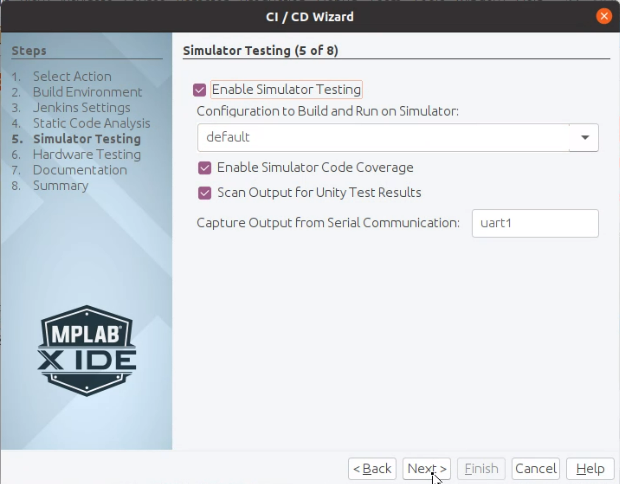 | Capture Output from Serial Communication | This option should be used together with the Scan output for Unity test results option. The simulator needs to know from which serial communication module instance to capture the output from. The default value is uart1, but this is dependent on which device you are using and how you have configured your test setup. |