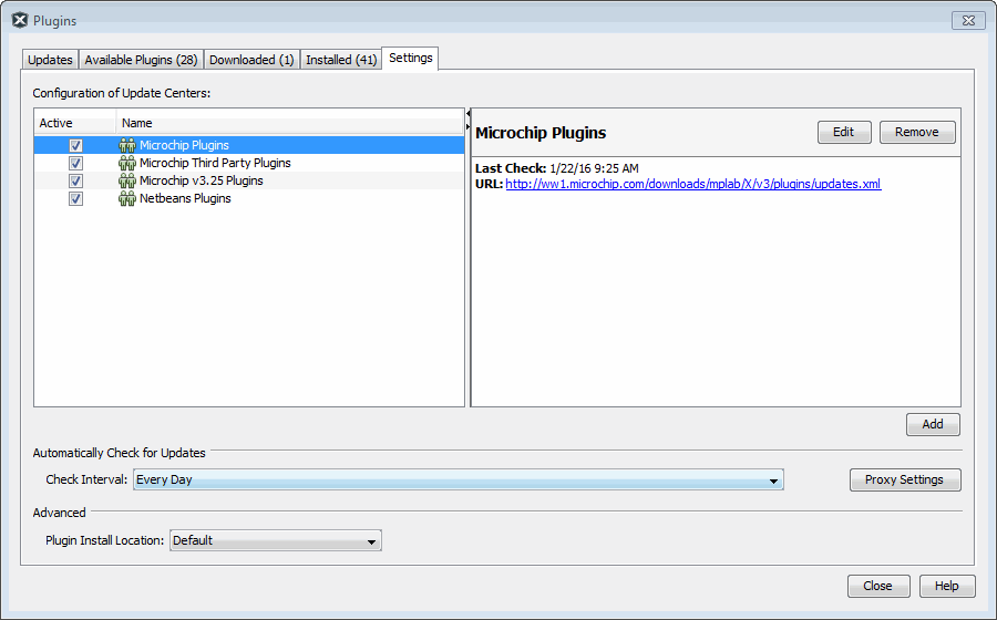 To see available plugins in the Plugins window, you must have one or more update centers configured. MPLAB X IDE comes with two Microchip Update Centers already configured: