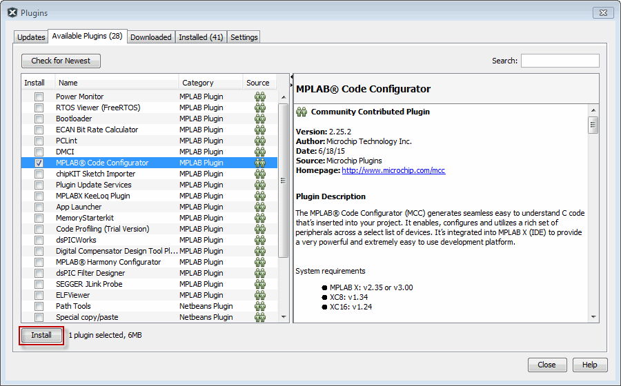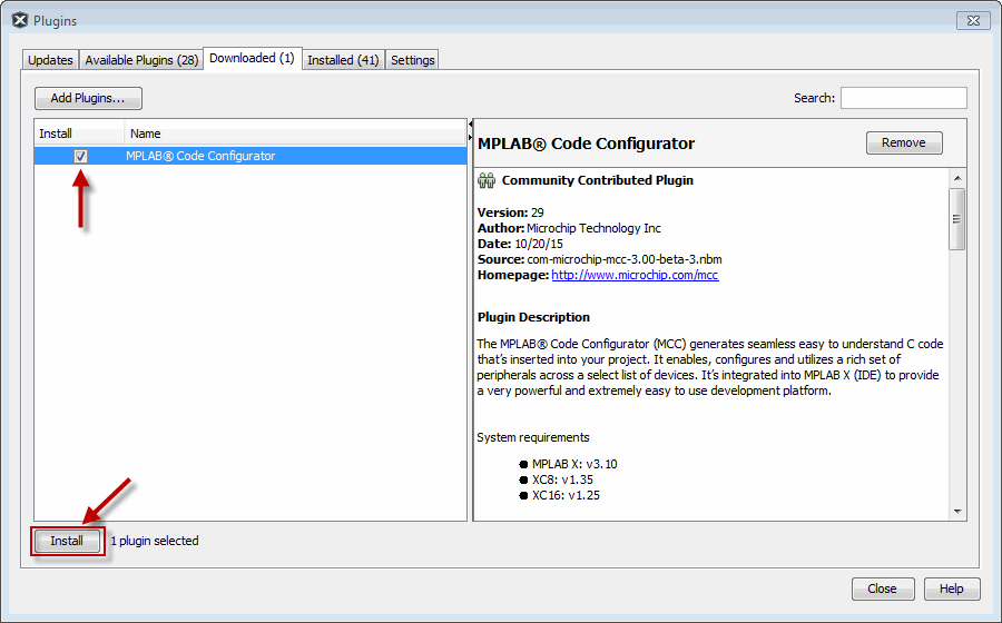 - In MPLAB X IDE, select and click on the Available Plugins tab.