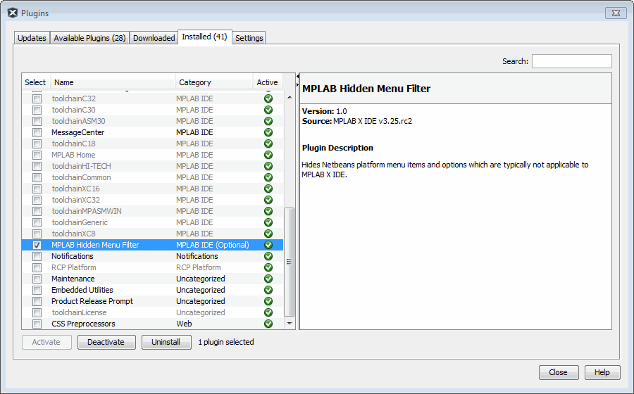 MPLAB X IDE comes with a number of plugins installed. Although ungrayed items may be deactivated or uninstalled, this is not recommended unless the category is listed as optional.