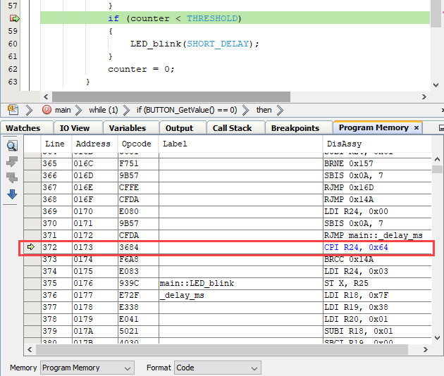 the button on the evaluation board. The code will halt at the breakpoint. - Select .
