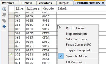 To set Memory window options, right click in the Memory window to pop up a menu with various options such as display options, fill memory, table import/export, and output to file. The content of the menu depends on the window. See MPLAB X IDE Windows and Dialogs.