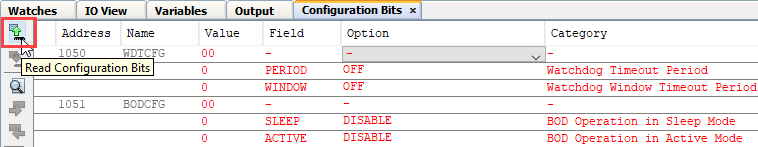 To refresh some windows, a read of device memory is needed. For AVR devices, the Configuration Bits memory window needs to be read before it can be edited.