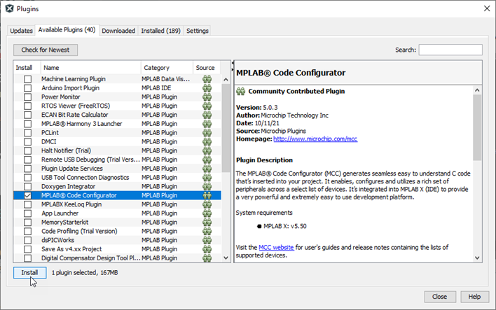To see the MCC configuration that generated these files, you can install the MCC plugin by going to , checking MPLAB Code Configurator and clicking Install.