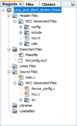 Expand the project tree to see project files in MCC Generated Files folders. This means that the project was generated using the MPLAB Code Configurator, or MCC.