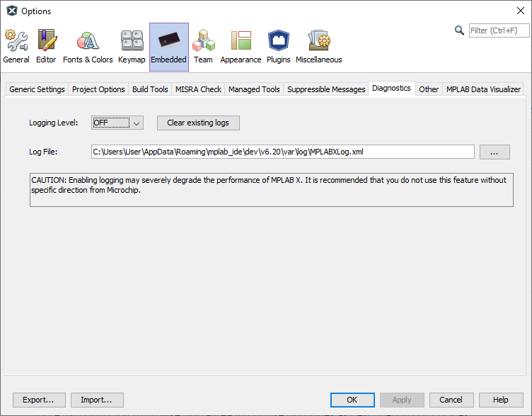 - Select (MPLAB X IDE > Preferences for macOS), Embedded button, Diagnostics tab.