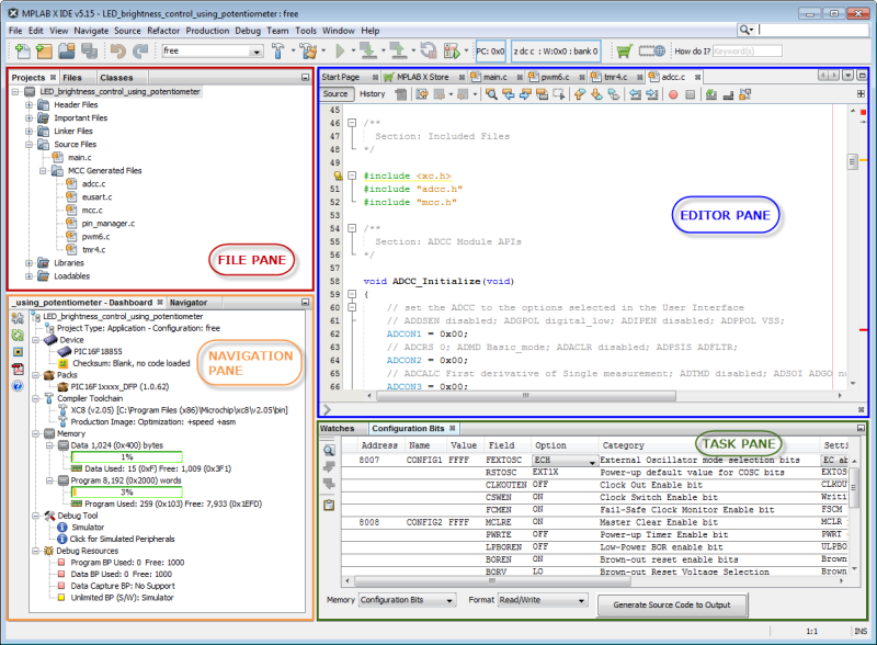 The MPLAB X IDE desktop is divided into four panes. When you have created your project, several windows will open in these panes.