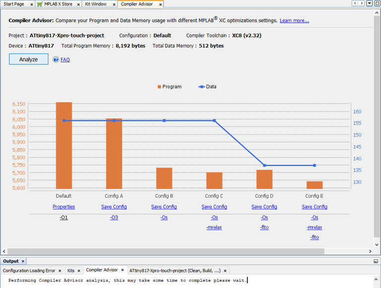 - Demonstrating the advantages each optimization provides for a project in an easy-to-read, graphical form for program and data memory size.