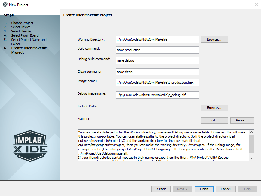 To create a new user makefile project in MPLAB X IDE, follow steps 1-5 from User Makefile Project – Create Code from a Batch File. For Step 6, set up as per figure below.