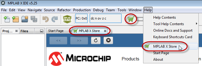 Click on the MPLAB X Store tab to purchase tools from the Microchip store. The tab is formatted to showcase some of the latest items for sale pertaining to MPLAB X IDE. You can also browse categories to find other items.