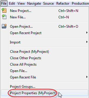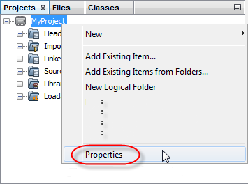 Once a project has been created, you can view or change the project properties in the Project Properties window. Access this window by performing one of the following actions.