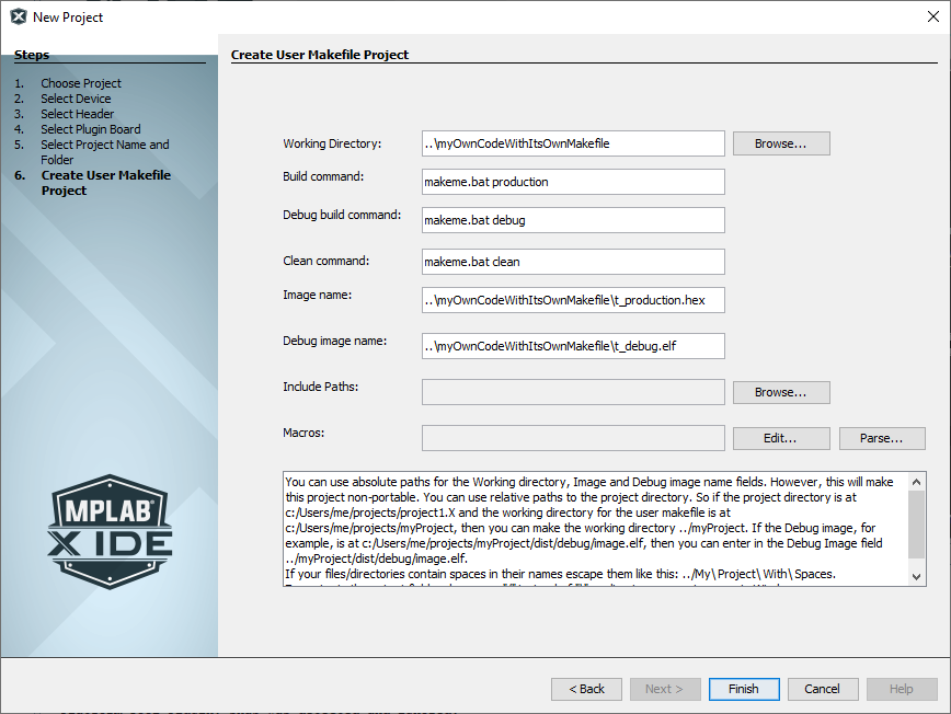 Doing this, however, makes the MPLAB X IDE project less portable. Therefore the Working Directory, Image name and the Debug image name will be entered as relative paths with respect to the MPLAB X IDE project directory.