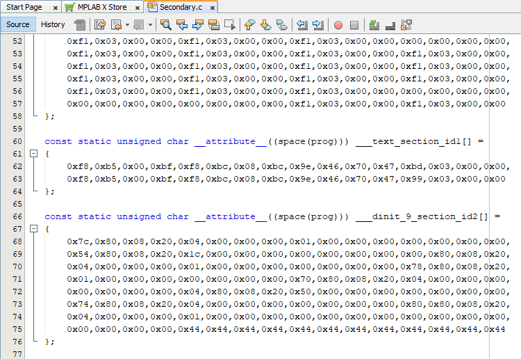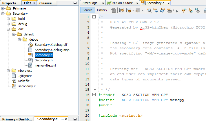 When the Primary and Secondary projects are built for debug, two additional files are generated by the MPLAB XC32 bin2hex utility: a header file (discussed in Select Secondary Project Header) and a C file (in this example Secondary.c).