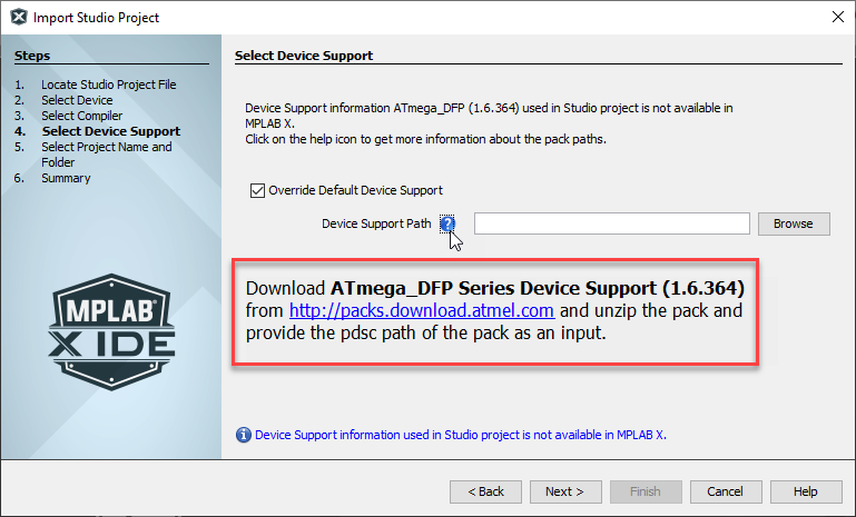 If the Device Support Path is NOT populated, then you can download the pack support by clicking on the help icon (question mark) and following the instructions. When you download the pack, it will install in Atmel Studio. Browse to this location to select the pack. For Windows OS: C:\Program Files (x86)\Atmel\Studio\7.0\packs