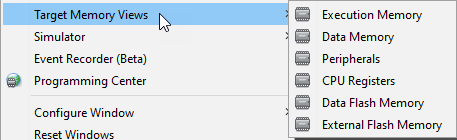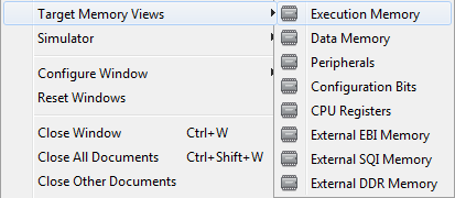 Memory windows (Window>Target Memory Views) display the many types of device memory, such as SFRs and Configuration bits. Use the “Memory” and “Format” drop-down boxes to customize your window.