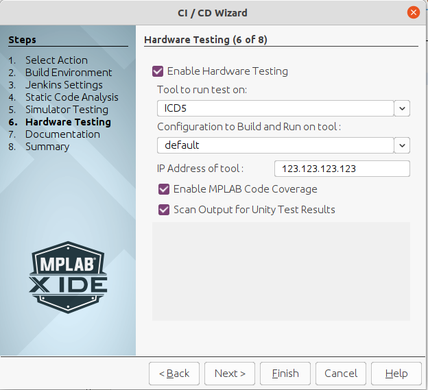 From the CI/CD Wizard you should now be ready to enable the MPLAB ICD 5 hardware testing as part of the Jenkins build pipeline generation.