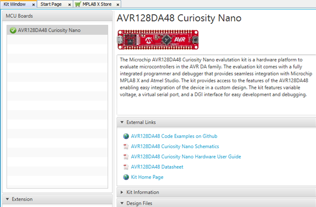 MPLAB X IDE will auto-detect that the evaluation board is connected. The Kit Window in MPLAB X IDE will present relevant information like data sheets and board documentation (see figure below). The AVR128DA48 device on the AVR128DA48 Curiosity Nano board is programmed and debugged by the on-board debugger and, therefore, no external programmer or debugger tool is required.