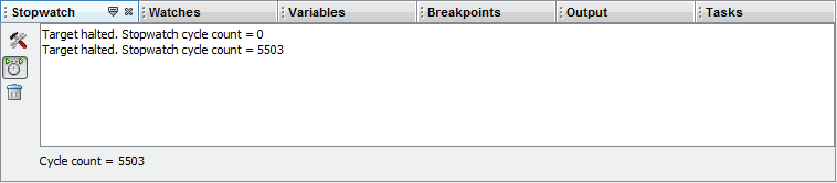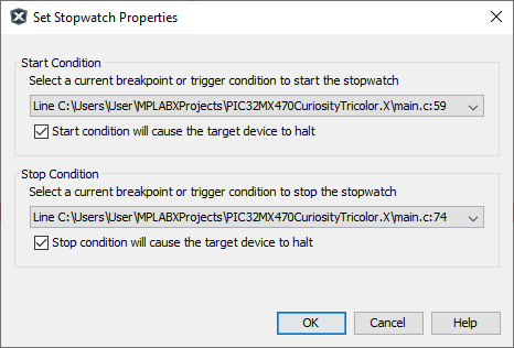 ![]() | Properties | Set Stopwatch properties. Select one current breakpoint or trigger to start the stopwatch and one to stop the stopwatch. |