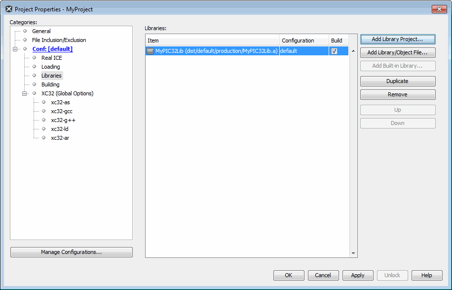 Open the Project Properties window and click on the Libraries category. Any files added to the Libraries folder in the Projects window will be visible here. You may add additional files and manage these files using the buttons on the right.