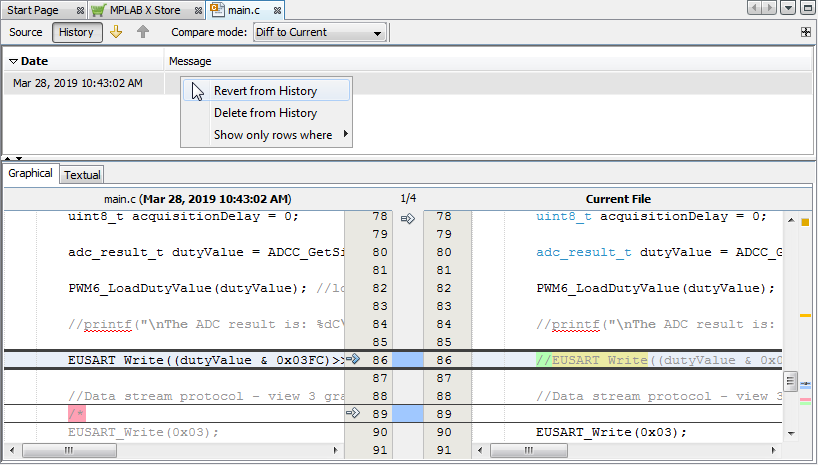 MPLAB X IDE has a built-in local file history feature, a benefit of the NetBeans platform. This feature provides built-in versioning support for local projects and files that is similar to conventional version control systems. Available tools include a local DIFF and file restoration.