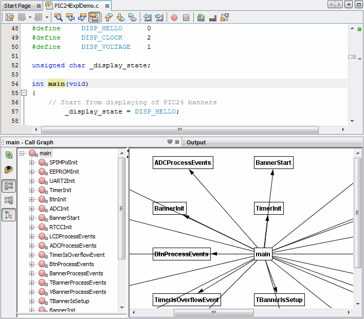 The Call Graph window displays a tree view of either the functions called from a selected function, or the functions that call that function.