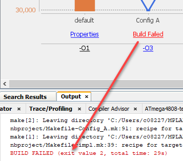 When a build fails due to certain optimization selections, you can click on Build Failed to go to where the error(s) are in the Output window.