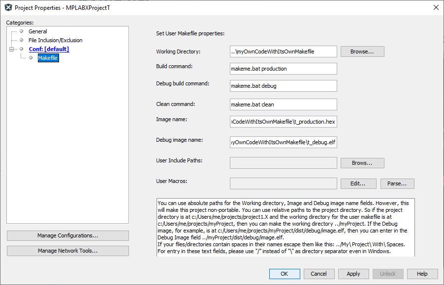 For this example, the results of build (t_production.hex) and debug build (t_debug.elf) are found in the myOwnCodeWithItsOwnMakefile working directory. As only the MPLABXProjectT project directory is visible in MPLAB X IDE, you will not see any changes in the IDE Projects window after a build.