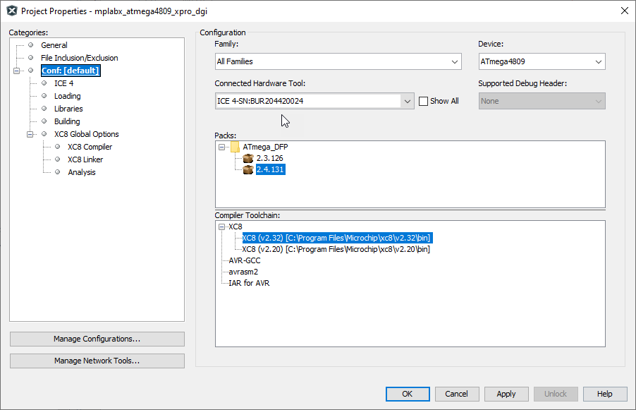 | Device | Name of the project device. Care should be taken when changing the device, especially to one from a different family, as the pack, hardware tool and compiler will need to be updated. |