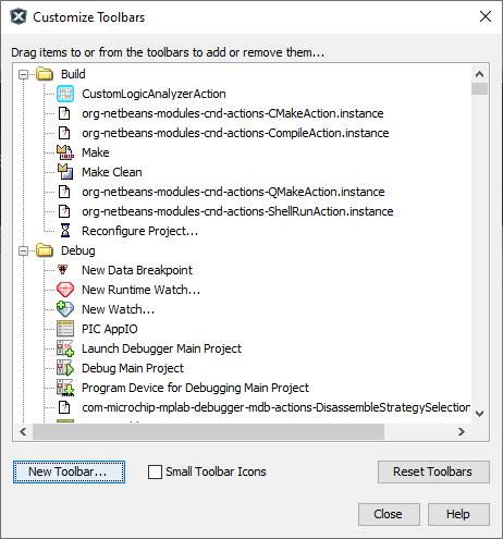 You can customize MPLAB X IDE toolbars using the Customize Toolbars window. Select to open the window.