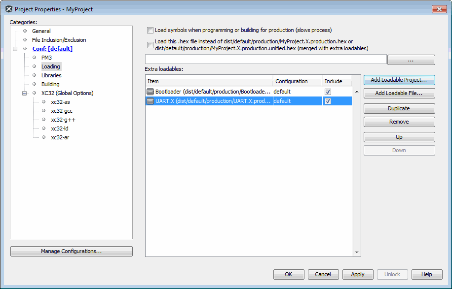 - Auto – Allow MPLAB IDE to determine whether the loadable file path should be relative or absolute based upon the its location. If the main project directory contains the loadable file, the reference is a relative path. Otherwise, the reference is an absolute path.