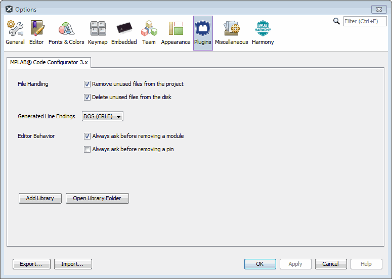 The Options window is a NetBeans platform window. However, it has been customized for MPLAB X IDE projects. If plugin(s) have been installed (using ) and they have plugin options, go to this window to see the available plugin options.