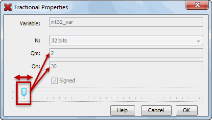 | Slider | Click and drag the slider to select the fixed point position (Qm vs. Qn) to be applied to the calculation of the fixed point fractional value. |