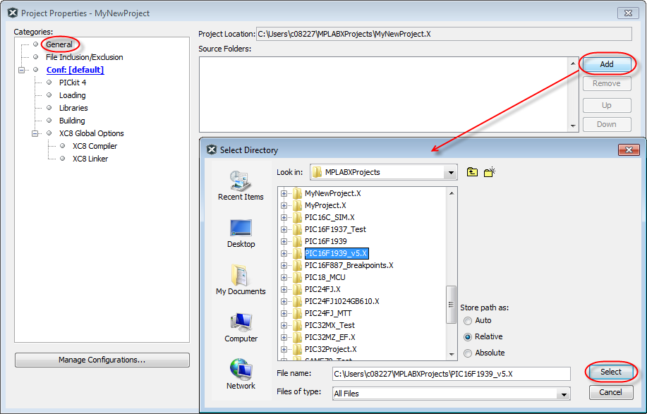 When you import an MPLAB IDE v8 project, the source files are not in the project folder. Use > MPLAB IDE v8 to automatically import the files.