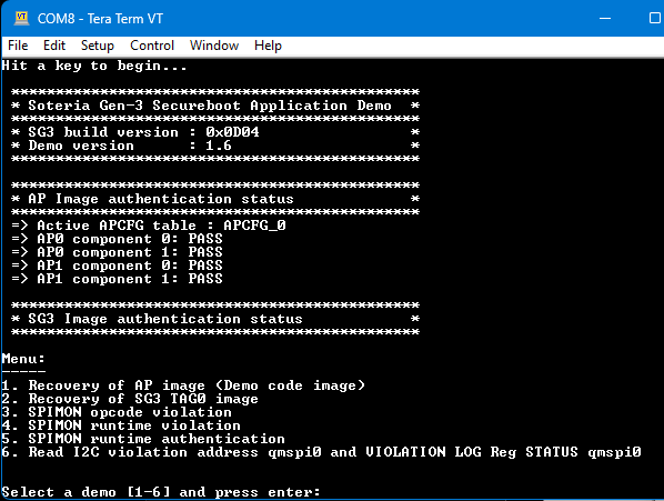 The EV42J24A evaluation kit has a CEC1736 device with predefined OTP settings and a Soteria-G3 firmware SPI image. With this device, a simple validation check can be performed to verify that the board is working properly.