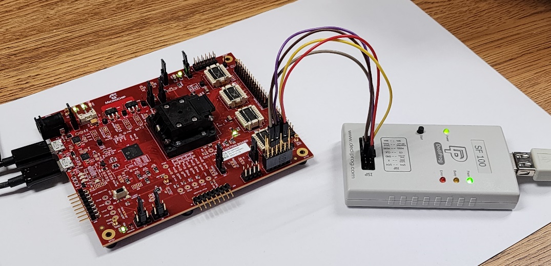 As described in 4.3.1 Programming with the DediProg SF600, the recommended method for programming the SPI NOR Flash chips on the EV42J24A is via the use of a DediProg SF600 level, in-system programmer. However, many users have only an SF100 level programmer available, and the previous board for the CEC173x was only supported by the SF100. The SF100 programmer can be enabled to work with the EV42J24A by using a flywire connection, as shown below. Jumper wires can be easily attached between pins on the programmer and the EV42J24A.