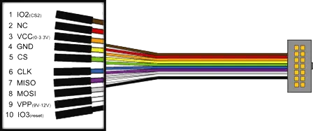 Alternatively, DediProg supplies the ISP-SP-CB flywire cable. Using this cable and a 2x6 header socket, it is easy to make a simple programming cable.