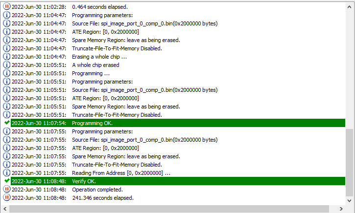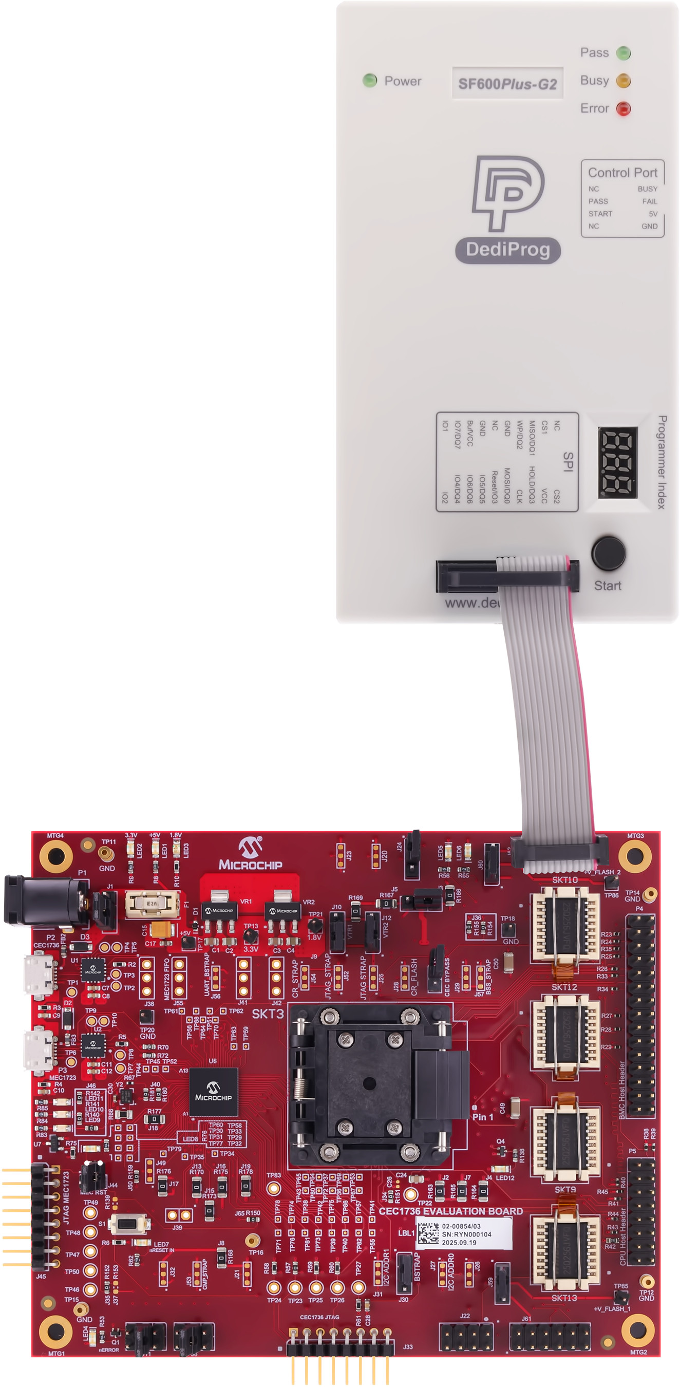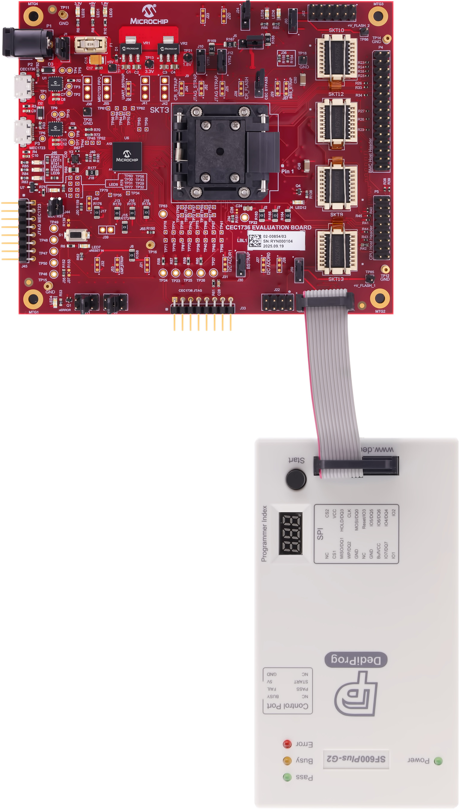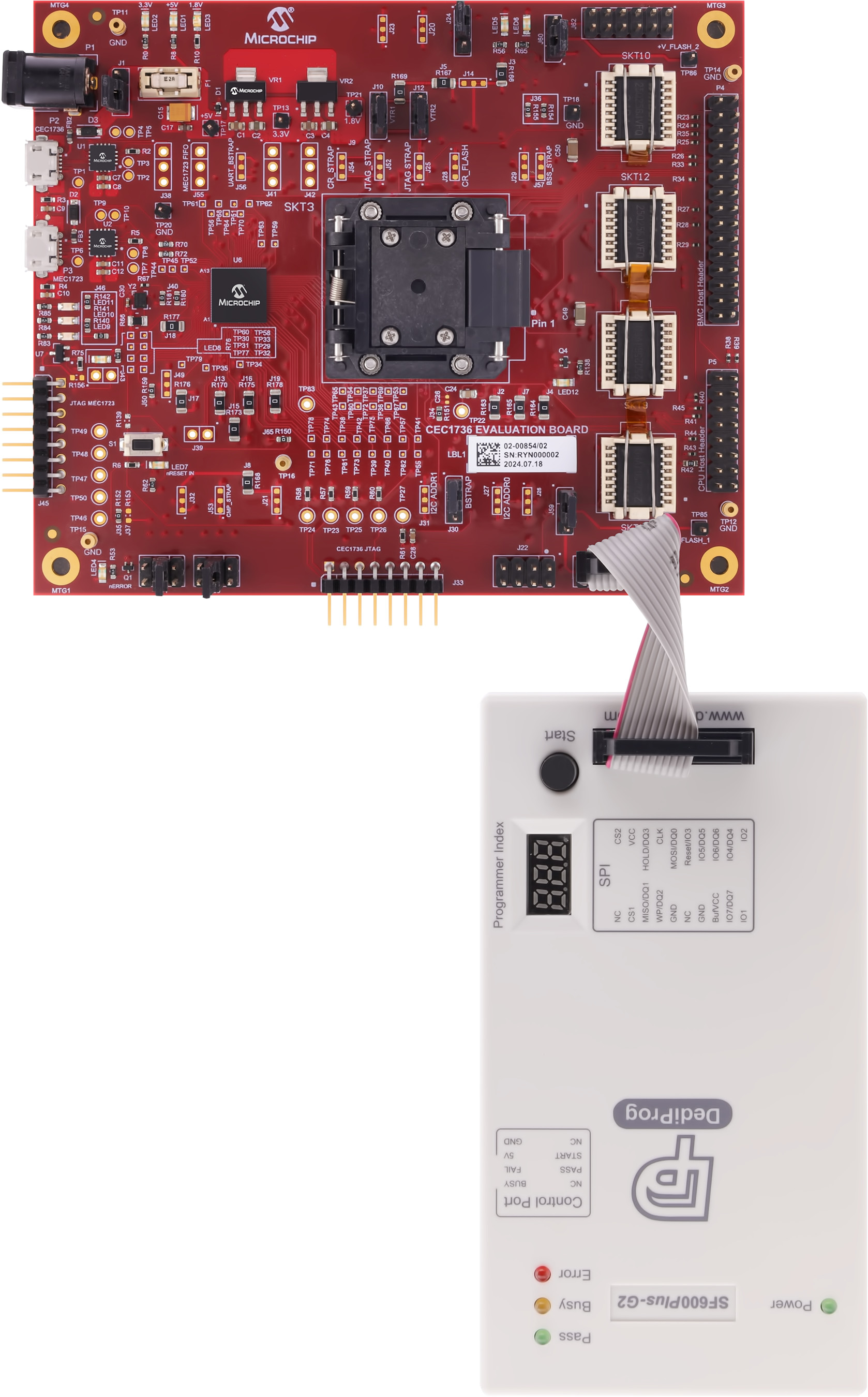 The recommended method of programming the SPI NOR Flash chips on the EV42J24A is to use a DediProg SF600 level in-system programmer. This programmer connects directly via ribbon cable to the 2x6 header on the EV42J24A. There are two programming headers on the board, and each header has access to two SPI chips. The DediProg software is then used to program the memory devices. The assertion of the correct chip select is controlled by the software, so there is no need to manually redirect the chip select line. Each header is connected to two SPI NOR Flash chips and are independent of each other.